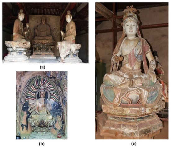 The halls and sculptures in the Qinglian Temple: (a) the interior of the Shangsibei Hall; (b) Sculpture of a Thousand Hand Guanyin statue in the Shangsibei Hall; (c) Sculpture of Bodhisattva Manjusri in the Xiasinan Hall.