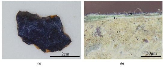 In addition, the in situ digital microphotographs (Figure 3) revealed multiple paint layers of the sculptures. At least two paint layers were found for each of the sculptures, which, from inside to outside, were green and black pigment (L1)–white powder layer–red pigment (L2) for the Ananda Buddha in Figure 3a and gilding and black pigment (L1)–white powder layer–red pigment (L2) for the Bodhisattva Manjusri in Figure 3b. Each L2 pigment layer was applied after the white powder layer was added on the original paint layer (L1), which implies that these multiple paint layers of the sculptures are the result of historical repainting. Repainting of seriously damaged sculptures was common in ancient China, and the craftsmen usually applied a white powder layer or a layer of paper to cover the original paint layer before repainting [2].