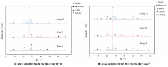 The XRD analytical results of all samples are listed in Table 1, and some representative XRD patterns are shown in Figure 5. The results suggest that quartz (SiO2), albite (Na(AlSi3O8)) and calcite (CaCO3) are the primary crystalline phases in both the coarse and fine clay layers; moreover, some muscovite ((KAl2(AlSi3O10) (OH)2) is also found in both the coarse and fine clay layers. The crystalline phases of the clay used to make the base clay layers of the sculptures across these different ancient Chinese dynasties also appear to be similar, suggesting that the craftsmen of the Tang, Song and Ming dynasties may have focused on the use of local clay to make these painted clay sculptures. According to the literature, the coarse and fine clay layers of sculptures were both generally made by mixing clay, sand and fibre together [2], and in this study, the clay used to make the coarse and fine clay layers appears to be consistent. The reasons for the different microstructures of the coarse and fine layers are thus mainly found in the different proportions of clay and sand, the different particle sizes of clay and sand selected for each layer and the different fibres added.