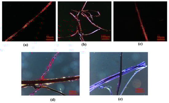 Morphology of paper fibres: (a) XSBD-F1; (b) XSBD-F2; (c) XSND-F4; (d) XSND-F5; (e) XSBD-F3.