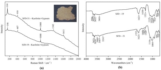 The white powder layer is sandwiched between the clay ground layer and the pigment layer, levelling the clay ground layer and covering its inherent colour to facilitate the application of pigments. Two samples (SJD-19, SFD-31) of white powder layer were analysed to determine their raw materials, and their Raman spectra, shown in Figure 7b, indicated that they were formed of a mixture of kaolinite and gypsum. The weak typical Raman peaks of 144/146, 407/410 cm−1 indicated the presence of kaolinite [15] while the peaks of 1008 cm−1 were attributed to gypsum, based on the bending vibration of SO42−. The Raman peaks of 1372 and 1611 cm−1 are characteristic of the D-band and G-band of amorphous carbon [16], which may indicate the presence of contamination or impurities. Possibly due to the strong fluorescence arising from other agents or the aging of the white powder layer, the typical Raman peaks of these two samples were somewhat unclear, however. The samples were thus also analysed using FT-IR spectra to confirm the Raman results. As shown in Figure 7b, the peaks of the FT-IR spectra at 3544, 3488, 3407, 3401, 3241, 1621, 1116, and 1115 cm−1 confirm the present of gypsum. Besides, the peaks at 3695, 3696, 3652, 3651, and 3620 cm−1 were assigned to O-H stretching, while those at 1033, 1032, 1004, and 1003 cm−1 were assumed to belong to Si-O stretching. The peaks at 936 and 912 cm−1 were then attributed to Al-OH stretching and Al-OH bending, respectively, with those at 793, 789, 755, 753, and 696 cm−1 assigned to Si-O, Si-Si and Si-Al stretching. All these peaks were identified as belonging to the the 1: 1 type of clay minerals.