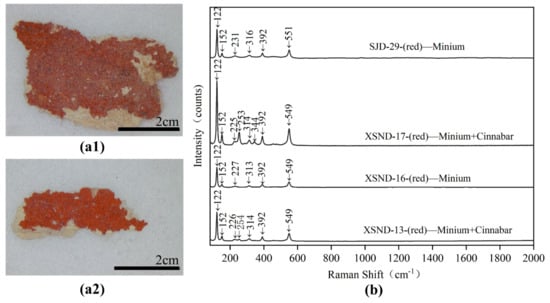The samples of XSND-13, 16, 17 and SJD-29 were of paler red and even orange-red hues. The EDS results (shown in Table 2) of samples XSND-13 and 17 show that they mainly contain elements such as S, Hg, Pb and O, and their Raman spectra shown in Figure 10b confirm that they are a mixture of minium and cinnabar. Their Raman bands at 122, 152, 225/226, 314, 392 and 549 cm−1 were ascribed to minium (Pb3O4) [22], while the absorption at 549 cm−1 was attributed to the stretching of the Pb-O bond [23,24]. The bands at 253/254 and 344 cm−1 were identified as belonging to cinnabar (HgS) [22], while the Roman peaks at 253 and 254 cm−1 were attributed to the stretching vibration of Hg-S bonds [25,26]. For the sample XSND-16 and SJD-29, the main elements being Pb and O, their characteristic Raman bands (Figure 10b) at 122, 152, 227/231, 313/316, 392 and 549/551cm−1, were attributed to minium (Pb3O4). The Raman results combined with SEM-EDS analysis indicated that the red pigment samples XSND-13, 16, 17 and SJD-29 were thus minimum or a mixture of minium and cinnabar: this is reasonable, as using mixed materials made from two or more pigments in one colour layer to achieve the desired hue is a common traditional technique in Chinese artworks [2,4,27].