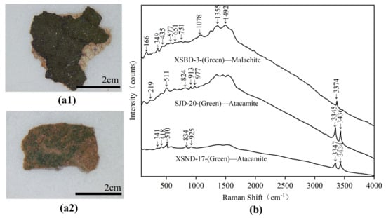 The light green pigment (XSBD-3) was confirmed as malachite (Cu2(OH)2CO3) based on its Raman spectra (seen in Figure 11b) of 166, 349, 435, 1078, 1355, 1492 and 3374 cm−1, which are the characteristic Raman peaks of malachite [4,30,31]. Its high C, Cu and O content as assessed by SEM-EDS is essentially also in accordance with malachite.