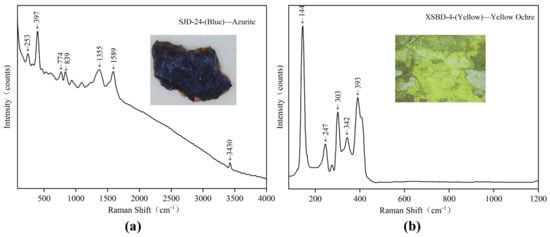 One blue pigment (SJD-24) in the polychrome clay sculpture of Qinglian Temple was detected as azurite (Cu3(CO3)2(OH)2. All peaks as seen in Figure 12a between 200 and 1600 cm−1 (253, 397, 774, 839, 1355 and 1589 cm−1) in the blue sample were characteristic azurite (Cu3(CO3)2(OH)2) [35]. The Raman band at 3430cm−1 was assigned to the OH stretching region [29]. The relatively high Cu, C and O contents within the SEM-EDS confirm the Raman result.