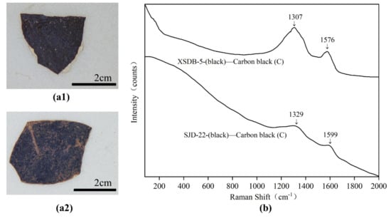Digital microscopy (DM) of black samples (a1) SJD-2; (a2) XSBD-5 and Micro-Raman spectroscopy (b) SJD-2; XSBD-5.