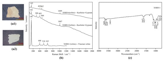 Digital microscopy (DM) of white pigment samples (a1) XSBD-1; (a2) XSBD-6, Micro-Raman spectroscopy; (b) XSBD-1; XSBD-2; XSBD-6 and FT-IR spectra; (c) XSBD-1.
