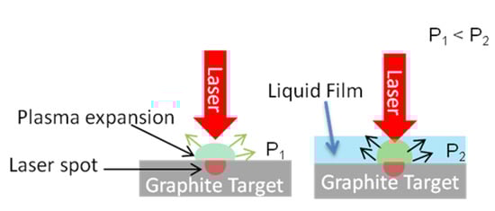 Liquid media are commonly used to effectively enhance the laser ablation rate of solid materials [22]. The enhancement was reported to be caused by the formation of superheated liquids under high pressure during the laser pulse and its rapid vaporization between two pulses [23,24,25]. It was reported that a laser beam on a silicon surface covered with a water film can induce a “water hammer” or liquid jet with a pressure of up to several hundred MPa [26]. In addition, the same authors reported that plasma was generated by the laser beam within the confined liquid layer, which triggered an even higher pressure. Other authors attributed the improved ablation observed under water to the transmission of a plasma plume via a dynamic fluid flow [27], which facilitates the removal of the target material. Ren et al. suggested that when a plasma is confined in a liquid, the loss of energy is reduced and the etching is improved [28]. Thus, we illustrate the phenomenon in the following simplified way (Figure 1).