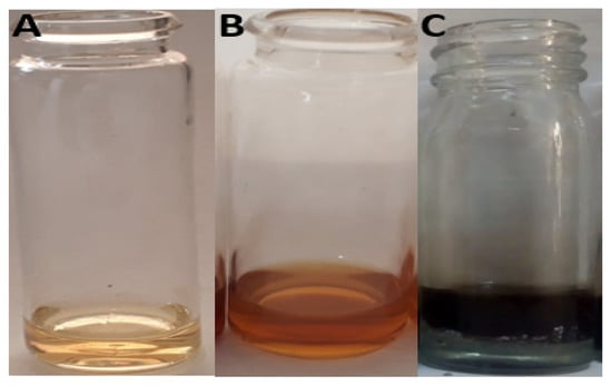 (A) Leaf extract + AgNO3 solution before reaction, (B) Leaf extract + AgNO3 solution after 1 h, and (C) Leaf extract + AgNO3 after 24 h.