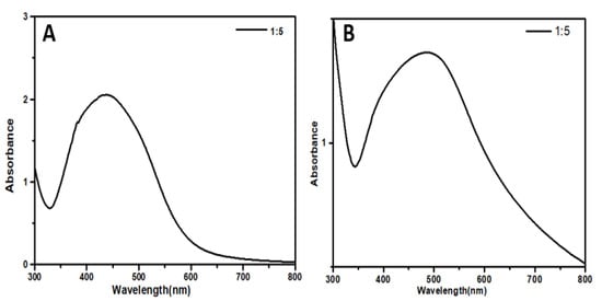 After adding leaf ethanolic extract to 1 mM silver nitrate solution, the color of the solution changed from light green to dark brown, indicating the synthesis of silver nanoparticles Figure 2A,B. Bulb aqueous extract also changed from whitish to dark brown when added to silver nitrate solution, thus indicating the fabrication of silver nanoparticles. Silver nanoparticles were previously synthesized by Ref. [] (Origanum vulgare) and Ref. [] (Pechual-loeschea leubnitzia). Production of AgNPs was carried out by Ref. [] (Allium sativum) and Ref. [] (Allium cepa) using bulb extract as a reducing and capping agent for silver ions. Changes in color of the sample solutions from light green and whitish to dark brown revealed AgNPs formation, as shown in Figure 3A–C. The formation of the brown color was due to the conversion of Ag+ ions into elemental silver with size ranges in nanometers. AgNPs synthesize by the bio reduction of Ag+ on exposure to metabolites, i.e., flavonoids, proteins, carbohydrates, enzymes, phenols, etc., present in plants which mainly reduce the metals to the nanoscale. The appearance of brown coloration is due to the excitation of surface plasmon resonance indicating silver nanoparticles fabrication, and it is the main characteristic of AgNPs [].