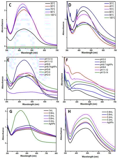 (A,B) UV-visible spectra of AgNPs/A. vittata having different AgNO3/Plant ratios, (C,D) effect of pH on the stability of AgNPs, (E,F) effect of temperature on the stability of AgNPs, and (G,H) effect of salt (NaCl) on the stability of AgNPs.