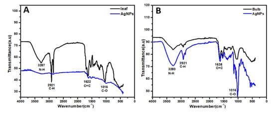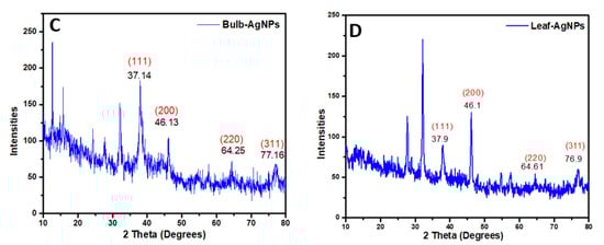The biogenic AgNPs were synthesized from biological moieties for the FTIR measurements to identify the ethanolic leaf extract and aqueous bulb extract biomolecules and their possible involvement. The FTIR spectra of dried leaf-capped AgNPs are shown in Figure 5A. The FTIR spectra of leaf-capped AgNPs showed peaks at 3287, 2921, 1622, and 1016 cm−1 (Figure 5A). The results showed that shifts at 3287 cm−1 were allocated to the N-H group, 2921 cm−1 for the C-H bond, and 1622.3 cm−1 and 1016 cm−1 shifts were due to C=C and C-O, respectively [] (Figure 5A). The carbonyl groups proved the presence of flavanones that are adsorbed on the surface of metal nano-sized particles by interaction through π-electrons in the carbonyl groups in the absence of a sufficient concentration of chelating agents. It was also confirmed that the carbonyl group from the protein and amino acid had a stronger ability to bind with metal nanoparticles or act as capping and stabilizing agents. Similarly, in the frame of the current study, the FTIR spectra of dried bulb-capped AgNPs show peaks at 3280, 2921,1638, and 1016 cm−1 (Figure 5B). It was concluded that bands at 3280 cm−1 were allocated to the N-H group, the band at 2921 cm−1 showed a C-H bond, 1638 cm−1 was allocated to C=O, and the shift at 1016 cm−1 was due to the C-O group, as described by Massey et al. []. An aqueous solution of A. vittata was phytochemically tested to determine its active compounds. The phytochemical analysis of A. vittata showed the presence of flavonoids, alkaloids, and coumarins []. The intensities of the spectral peaks of both leaf-capped AgNPs as well as bulb-capped AgNPs were reduced compared to those of plant extract as well as bulb extract, respectively. The results indicate that at spectral bands of AgNPs where peak intensity was reduced or disappeared, the functional groups (phytochemicals) present in that region were generated by the subsequent oxidation involved in reducing silver ions and forming nanoparticles []. Additionally, the presence of carbonyl groups proved the presence of flavanones that are adsorbed on the surface of metal nano-sized particles by interaction through π-electrons in the carbonyl groups in the absence of a sufficient concentration of chelating agents. It was also confirmed that the carbonyl group from the protein and amino acid had a stronger ability to bind with metal nanoparticles or act as capping and stabilizing agents [] (Figure 5A,B). X-ray diffraction crystallography is a technique used to identify the molecular and atomic structure of crystals, in which crystal-shaped atoms cause a beam of accident X-rays to diffract in many specific directions. The crystallinity of dried AgNPs capped by leaf and bulb extracts of A. vittata was confirmed, respectively, with the help of X-ray diffraction. The X-ray diffraction pattern of silver nanoparticles showed the Braggs representation of the face center cubic structure of silver. The characteristic diffraction peaks of fcc silver lattice for bulb synthesized nanoparticle were at 37.9, 46.13, 64.25, and 77.16 in 2Ø with corresponding planes at (111), (200), (220), and (311), respectively. For leaf extract mediated nanoparticles, the XRD diffraction pattern showed diffraction peaks at 37.9, 46.1, 64.61, and 76.9 in 2Ø with corresponding planes at 111, 200, 220, and 311, respectively [] (Figure 5D). The crystalline nature of bulb and leaf fabricated silver nanoparticles were confirmed by XRD analysis. The formation of lattice planes of nanoparticles was indicated by the XRD pattern. The presence of small-sized nanomaterial and no evidence of the presence of bulk residue (remnant) and impurity were expressed by the peak broadening of this pattern [] (Figure 5C,D).