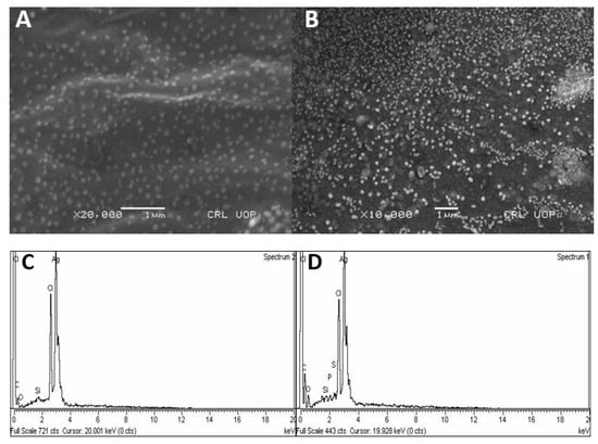 SEM analysis of biosynthesized silver nanoparticles was also reported by Devi et al. [] using Euphorbia hirta leaf extract, and their work concluded the presence of spherical and cubic-shaped silver nanoparticles. Analysis of scanning electron microscopy reported the presence of spherical-shaped and monodispersed leaf-AgNPs and bulb-AgNPs. The reduction process held at the nanoparticle surface was also determined by micrograph of SEM analysis, as shown in Figure 6A,B. According to [], the presence of agglomeration in some particles is because of Van der Waals forces (intermolecular interactions) between these nanoparticles. Energy dispersion spectroscopy of silver nanoparticles was previously reported using Pechual-loeschea leubnitzia, as stated by Mofolo et al. [], and Vitis vinifera []. Their results investigated the presence of elemental Ag as well as carbon, nitrogen, and oxygen. Their results follow our results for EDX analysis, as shown in Figure 6C,D.