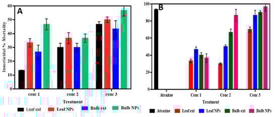 Insecticidal activity evaluation was carried out using silver nanoparticles prepared from leaf and bulb extract using A. vittata plants against Tribolium castenium at different concentrations, i.e., 100, 500, and 1000. It was observed that silver nanoparticles are more effective and potentially applicable against Tribolium castenium than extracts. The result indicated that the highest mortality rate was significantly (p < 0.05) observed in bulb-capped AgNPs at 1000 µg/mL with a 56.6% mortality rate, followed by leaf-capped nanoparticles which show the highest significant (p < 0.01) mortality rate of 50% at 1000 µg/mL. Leaf extract showed a significant (p < 0.05) mortality rate of 46.67% at 1000 µg/mL, while bulb aqueous extract showed a significant (p < 0.05) mortality rate of 43.34% at 1000 µg/mL (Figure 7A). Using Tribolium castaneum (wheat insect), analysis for the evaluation of the insecticidal activity of silver nanoparticles was carried out using malathion [] and Myriostachya wightiana []. The results reported that these silver nanoparticles showed 100% and 55.2% mortality rates, respectively. Our result observed a 56.7% and 50% mortality rate for bulb and leaf extract fabricated silver nanoparticles, respectively, as shown in Figure 7A. AgNPs cause dehydration of insect integument and, with the help of abrasion and sorption, cause damage to the cuticle layer by destroying the protective wax present in the cuticle. It was also revealed that blockage of the trachea and spiracles of insects occurs due to the impairment of the alimentary canal on exposure to AgNPs, which leads to mortality, as documented by Rouhani et al. [].
