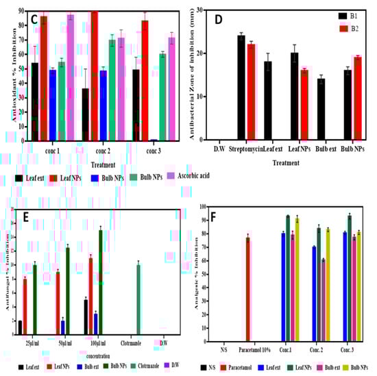 Insecticidal (A), phytotoxic (B), antioxidant (C), antibacterial (D), antifungal (E), and analgesic (F) activity of leaf-capped AgNPs and bulb-capped AgNPs.