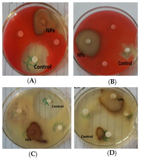 A comparative antibacterial assay was performed against pathogenic bacterial strains using the disc-diffusion (Kirby–Baurer) method. All samples with three concentrations (25 µL/mL, 50 µL/mL, and 100 µL/mL) were prepared in distilled water. The experiment was carried out in triplicate. For sterilization, all the experimental instruments and nutrient agar were autoclaved at 121 °C and 17 lb pressure for one hour. The media was transferred into sterilized Petri dishes after sterilization and kept overnight at room temperature for solidification of media and to check for any contamination. A 10 µL bacterial suspension was poured on solidified media with the help of a micropipette and was spread with a glass spreader. Four paper discs were placed on the medium in each plate and subjected to different concentrations of leaf-AgNPs, bulb-AgNPs, and plant (leaf and bulb) extracts. The standard drug (streptomycin) and distilled water were used as +ve and −ve controls, respectively. All plates were incubated at 25 °C for 24 h. Antibacterial activity was observed by measuring inhibition zones with an ordinary scale [,].