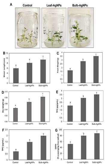 Effects of leaf-AgNPs and bulb-AgNPs regarding the in vitro micropropagation, growth response, and biomass production of Solanum tuberosum L. plantlets grown under a controlled environment. (A) Comparison of plant height, (B) shoot length, (C) fresh weight, (D) dry weight, (E) total flavonoid content, (F) total phenolic content, and (G) DPPH (% free radical scavenging activity) at 30 DAC. Values are the mean ± standard error from three replicates. Different letters indicate a significant difference (p < 0.05) in values between control and treated plantlets.