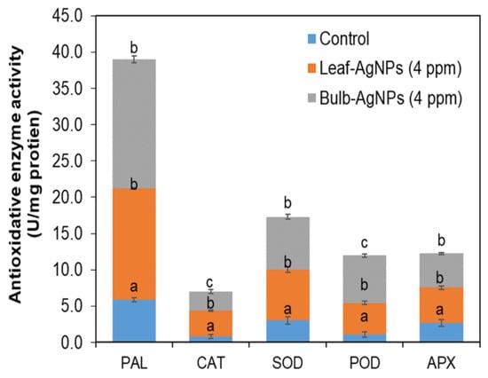 Effects of leaf-AgNPs and bulb-AgNPs on activities of antioxidative enzymes (PAL, CAT, SOD, POD, and APX, in U/mg protein) in Solanum tuberosum L. plantlets grown under a controlled environment in in vitro conditions. Values are the mean ± standard error from three replicates. Different letters indicate a significant difference (p < 0.05) in values between control and treated plantlets.