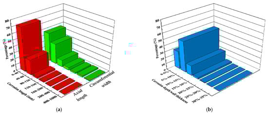 The magnetic flux leakage testing data of a pipeline obtained from 2011 to 2012 indicate the presence of 8131 external metal loss defects in the pipeline, with an average of 8.76 defects per kilometer, with a maximum defect depth of 35% of the wall thickness. These metal loss defects mainly include manufacturing defects (about 29.6%) and corrosion defects (about 70.4%). According to the external metal loss defect size distribution of a pipeline (Figure 1), most of the metal losses were defects with a small length and width, and the defects with a metal loss depth of less than 10% of the wall thickness accounted for nearly 80%. Moreover, 62 corrosion dents were detected during internal inspection, all of which corresponded to low external corrosion, with a maximum dent depth of 5.38% of the outer diameter OD and a maximum corrosion depth of 20% of the wall thickness.