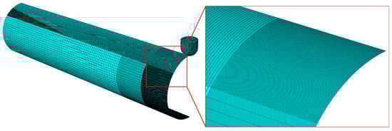 Symmetric boundary conditions were set to the circumferential cross-section and the axial cross-section at the pressing position under the indenter. The axial displacement of the cross-section at the far end of the pipe was restricted and the pipe bottom axis was fixed. The area that would be a dent was divided into dense mesh with 2 mm × 2 mm size, and other parts of the mesh were sparsely arranged to improve computational efficiency (Figure 4).