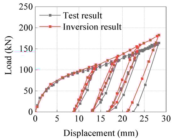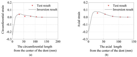 To verify the correctness of the finite element model, the load–displacement curves during the loading and unloading processes were compared between the inversion results and the test results, as well as the circumferential strain along Line 1 and the axial strain along Line 2 in Figure 3d. From the load–displacement curves (Figure 5) and the comparison of circumferential and axial strains of the outer wall of the pipe (Figure 6), the inversion results were found to be in good agreement with the test results.