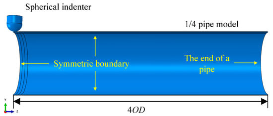 The pipeline model with external corrosion was established using a three-dimensional (3D), 8-node, hexahedron, quadratic, complete integral element (C3D8). According to the symmetry of structure and load, the 1/4 analysis model was established to improve the calculation efficiency. The semi-spherical indenter model was established using a rigid analytical body. The pipe diameter of the model is 813 mm, and the wall thickness ranges from 12.5 mm to 17.5 mm. According to the Saint-Venant principle [17], to avoid the influence of boundary conditions, the length between the center of the dent and the end of the pipeline should be four times the length of the outer diameter, as illustrated in Figure 7. A frictionless contact was defined between the indenter and the outer surface of the pipe.