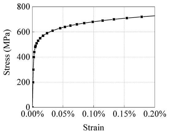 In the FE numerical simulation, it is necessary to use the true stress–strain curve of the material, which can be obtained by converting the engineering stress–strain curve obtained by the axial tensile test. The Ramberg–Osgood model [18] can also be used to express the stress–strain relationship, and the formula in CSA-Z662 [19] is represented as follows: