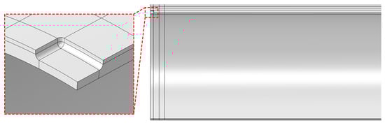 The external corrosion defects considered herein are assumed to be regular rectangles, and the size of the corrosion defects is described in terms of three indexes, namely, the axial length and the circumferential width and depth along the pipeline, as illustrated in Figure 9. The axial length of the corrosion defect is represented by (L is the corrosion length coefficient, D is the outer diameter of the pipe and t is the wall thickness); the circumferential width is represented by (W is the corrosion width coefficient); the corrosion depth is represented by d. In order to reduce the distortion caused by geometric discontinuity of the edge of the corrosion defect in the deformation process, chamfering is performed on the edge of the corrosion pit, as presented in Figure 10.