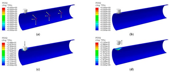 The entire analysis process is divided into four steps, as presented in Figure 11. First, the internal surface of the pipeline is defined, and the internal pressure load is applied. In the second step, a small radial displacement load pointing to the central axis of the pipeline is applied to the reference point of the indenter in a cylindrical coordinate system to establish contact between the indenter and the pipeline. In this process, contact stability control is used to resist rigid body displacement until contact is completely established. Then, the full displacement load is applied to the reference point of the indenter, to significantly hollow the pipe. Finally, a displacement load is applied in the opposite direction to the indenter to make it leave the surface of the pipeline, and the pipeline with defect loses its external load to complete the rebound. The Nlgeom option is enabled in the entire process to ensure the convergence and accuracy of the model’s nonlinear response under large deformation conditions.