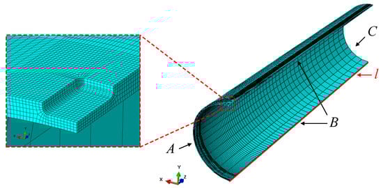 Symmetry constraints were set for both circumferential section A and axial section B. Section A constrains the displacement degrees of freedom (dof) U3 of axial displacement and the rotational dof UR1 and UR2 of the other two directions. Section B constrains the displacement dof U1 in the X direction and the rotational dof UR2 and UR3 in the other two directions. For the end section C, only the axial displacement dof U3 is constrained. Moreover, the dofs of six directions of the tube base line l are constrained. The FE mesh in the local region of the corrosion defect location is illustrated in Figure 12. The corrosion defect and dent deformation area are the stress and strain concentration area of the pipeline; thus, the grid in this part is encrypted. For other regions, the grid is thinned appropriately, according to the distance from defects, to improve the calculation rate.