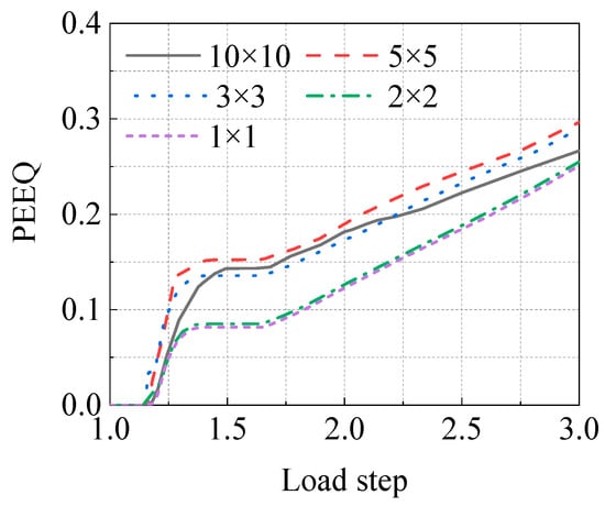 Through simulation, the equivalent plastic strain (PEEQ) of the inner surface of the corrosion defect center (Figure 13) was extracted for comparative analysis. It was revealed that when the mesh size was less than 2 mm × 2 mm, the results did not significantly change. The mesh with dimension of 1 mm × 1 mm was too dense; thus, the calculation cost of the simulation analysis was too high. Therefore, the 2 mm × 2 mm mesh was selected as the defect site mesh of the final FE simulation.