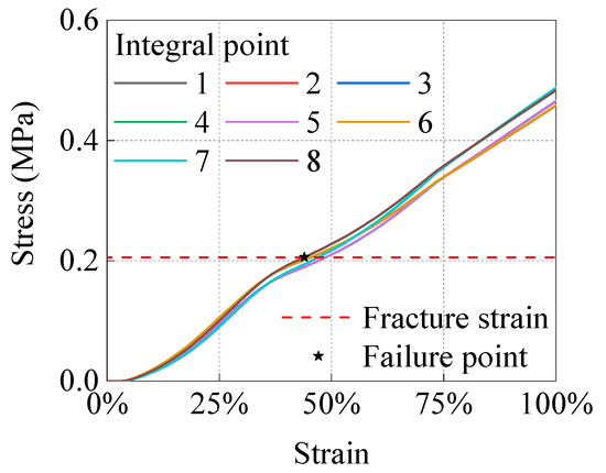 First, according to the mechanical parameters of the material presented in Table 2, the fracture strain of X65 pipeline was calculated to be about 0.2059. FE analysis was used to determine the first failure element of corroded pipeline in the process of depressed deformation (that is, when the equivalent plastic strain at any integral point of the model reaches 0.2059), which obtained the curve of equivalent plastic strain of the first failure element with dent depth. According to the fracture strain, the dent depth when the pipeline fails is determined as the critical dent depth dcr, and the more accurate dcr can be further determined by the interpolation method. Figure 14 illustrates that the FEM adopts a quadratic complete integral element with eight nodes; therefore, each element has eight integral points. The dcr is determined by selecting the integral curve that reaches the fracture strain first.