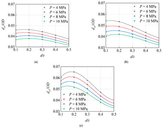 Moreover, a comparative analysis of the results of pipes with different OD/t indicates that, with the increase in OD/t, the curve range of the four different internal pressures becomes wider and wider, demonstrating that the P has an increasingly significant influence on the dcr.