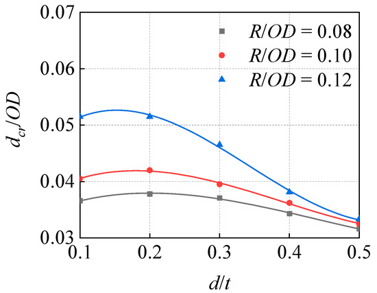 In order to explore the role of R in the influence of d on the dcr, a P = 10 MPa condition was considered as an example to draw the curve of the change in dcr/OD with d/t under the conditions of different curvature radius ratios of indenter to diameter R/OD, as shown in Figure 16. With the increase in d, the influence of the increase in R on the dcr decreases.