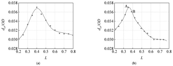 Notably, the influence of corrosion length and corrosion width on the dcr is similar. Under the analyzed calculation conditions, when the L = 0.4 and the W = 0.352 ( = 40.32 mm, = 35.47 mm), the dcr is the largest, and other length–width combinations are more dangerous. For small-size corrosion, when the length and width are close, both the length and width edges of the corrosion can contact the indenter, whose R = 65.04 mm at the initial contact stage, in a very short, semi-spherical indenter displacement. Owing to the special shell surface structure of the pipeline, when the annular width of the corrosion is slightly shorter than the axial length, the semi-spherical indenter can just contact the length and width edge of the corrosion at the same time, and the structure can bear the maximum external load of the indenter. Furthermore, Figure 17b illustrates that Point A (the combination of L = 0.4 and W = 0.352, i.e., = 40.32 mm, = 35.47 mm) is closer to the square combination and has a larger dcr than Point B (L = 0.4 and W = 0.387, i.e., = 40.32 mm, = 39.02 mm).
