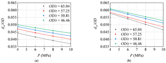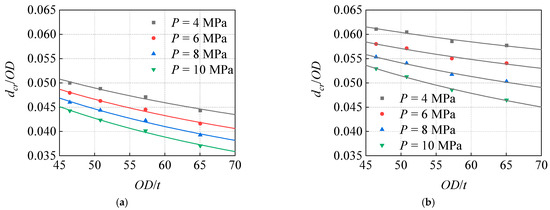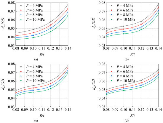 When the R/OD = 0.08 and 0.12, respectively, the curve of the dcr/OD, which changes with the P under different OD/t, is shown in Figure 18.