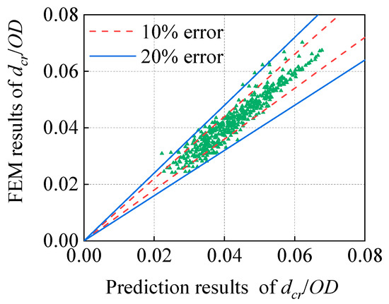 Based on the numerical results of FE calculation of 453 corroded dents, the nonlinear fitting software 1stOpt was used to fit each coefficient in the prediction formula of critical depression depths, and the correlation coefficient was found to be 0.9557. The fitting results are presented in Table 6 and Figure 21.