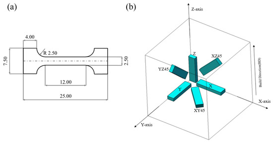 (a) Schematic of Ti-55511 alloy produced by SLM along with directions and (b) tensile specimen size (in mm).
