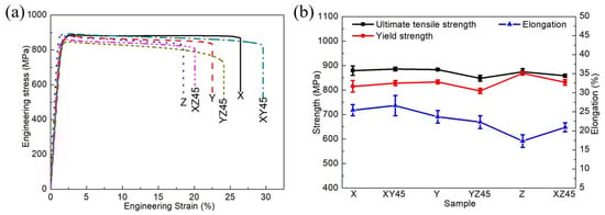 The representative engineering stress–strain curves of the as-fabricated samples are presented in Figure 3a. The obtained samples X, Y, Z, XY45, XZ45, and YZ45 exhibit UTS values from 848 to 886 MPa, YS values from 797 to 868 MPa, Young’s modulus (E) values from 59 to 79 GPa, and elongation to failure values from 17 to 27% (Table 3). Compared with those obtained by different methods of AM (Table 1), the measured mechanical properties of the as-fabricated samples exhibit the enhanced elongation properties. As is shown in Figure 3b, the UTS, YS, and elongation of samples X, Y, and XY45 can be considered roughly the same. This indicates that the mechanical properties of the samples are almost isotropic in the XY-plane. Unlike the anisotropic values which were reported for the Young’s modulus and elongation of the SLM processed Ti-55511 by Liu et al. [22], the YS of vertical sample Z (868.2 ± 7.4 MPa) is slightly higher than that of horizontal sample X (815.0 ± 23.6 MPa); however, vertical sample Z exhibits a similar UTS (874.5 ± 13.1 MPa) and lower ductility (17.3 ± 1.6%) values compared with horizontal sample X (879.4 ± 19.2 MPa and 25.4 ± 1.5%).