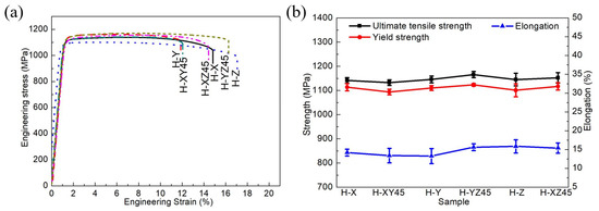 The representative engineering stress–strain curves of the aged samples are presented in Figure 4a. The samples H-X, H-Y, H-Z, H-XY45, H-XZ45, and H-YZ45 exhibit the UTS, YS, E, and elongation values from 1133 to 1166 MPa, 1093 to 1123 MPa, 98 to 111 GPa, and 13 to 16%, respectively (Table 4). Comparing these results with the SLMed samples’ results (as shown in Table 3), the mechanical properties of the aged samples demonstrate a higher tensile strength and elasticity modulus, but lower elongation than those of the SLMed samples. In addition, the mechanical properties of the aged samples in all orientations meet the aerospace allowable properties (YS of 1010 MPa and elongation of 8%) [19,23]. As is shown in Figure 4b, the UTS, YS, and elongation values of the aged samples can be considered roughly the same. Regardless of the anisotropic properties of the AMed Ti-55511 alloy (as depicted in Table 1), the mechanical properties of the aged Ti-55511 samples are almost isotropic. In order to deeply discuss the anisotropic properties, microstructural characterizations will be presented in the following section.