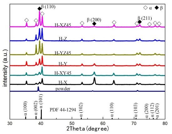 The X-ray diffraction patterns of the pre-alloy powder and as-fabricated samples are shown in Figure 5. After the SLM process, only the β phase was detected, which is the same as in a previous work [25]. The β diffraction peaks shift to higher angle in all the samples compared with the diffraction peaks of the β phase in the standard PDF cards (No. 44–1288).