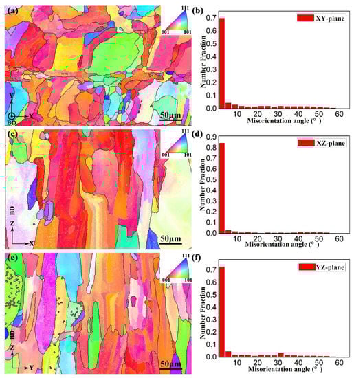 The EBSD inverse pole figure (IPF) maps of sample X at (a) XY-, (c) XZ-, and (e) YZ-planes, respectively. Misorientation angle distribution at (b) XY-, (d) XZ-, and (f) YZ-planes, respectively.