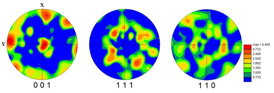 In order to verify the crystallographic orientation of β grains, further investigations with the EBSD are shown in Figure 9. According to the mechanism of texture evolution during the SLM process [40], the β textures display mainly a simple {001} fiber texture with a maximum intensity of about 6.46 times that of the random one. The rapid solidification across the interface between the boundaries of the primary-solidified area and resolidified area were discussed in detail in a previous work [25], which may lead to a lower degree of texture formation.
