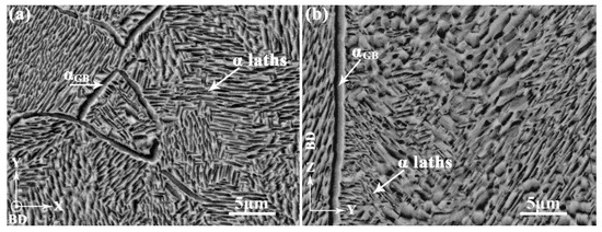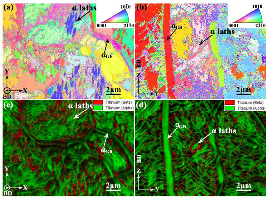 In order to perform comparative analysis, sample H-X was used to characterize the microstructure of the aged Ti-55511 alloy in this study. For metastable β titanium alloys, post-build aging has been used to give them high strength and moderate ductility via controlling the morphology, dimension, and volume fraction of the α phase [34,53]. This has been confirmed by a previous work [28]. Therefore, much attention should be paid to the influence of the α phase on relative mechanical properties. Since the XZ- and YZ-planes depicted similar microstructures in the previous Section 3.3.1, microstructures of the XY- and YZ-planes are utilized for analysis as shown in Figure 10a,b, respectively. According to the XRD analysis (Figure 6), a large number of α laths exist in the XY- and YZ-planes of the aged samples. At the same time, the αGB also exists at the prior-β grain boundaries according to the previous work [28]. The α laths seem to have no fixed crystal orientation either in the XY- or YZ-planes, which indicates a weak texture in the microstructure, as shown in Figure 10a,b. In particular, no significant β columnar grain is observed, indicating a large number of β phase are transformed to α laths in the aged samples. A more detailed investigation for the phase was conducted by EBSD, which will be discussed in the following part.