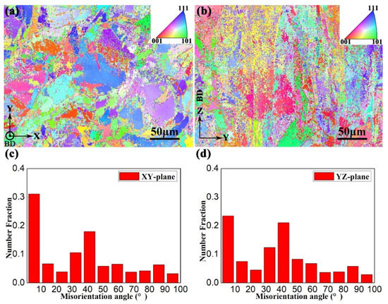 The EBSD inverse pole figure (IPF) maps of sample H-X at (a) XY- and (b) YZ-planes. Misorientation angle distribution at (c) XY- and (d) YZ-planes.