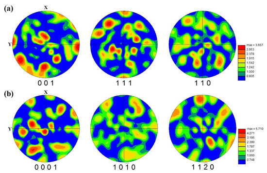 To confirm the weak texture, further investigations performed with EBSD and the corresponding results are represented in the pole figures of Figure 12. The maximum intensity of texture for the β phase was reduced from 6.460 times (Figure 9) to 3.667 times (Figure 12a) that of the random one. The reduction of texture at the β phase is consistent with the XRD analysis, which is shown in Figure 6. Meanwhile, Figure 12b illustrates the weak texture of α laths with the maximum intensity of 5.710 times that of the random one.