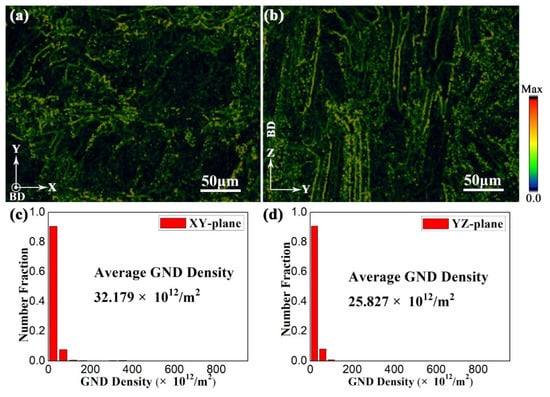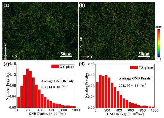 The GNDs and the corresponding distribution in sample X at the XY- (Figure 8a) and YZ-planes (Figure 8c) are displayed in Figure 14. The GND density can also be estimated according to the results of Dai et al. [64]. The average GND density of sample X in the XY- and YZ-planes is 32.18 × 1012 m−2 and 25.83 × 1012 m−2, respectively. Moreover, the number fraction of the GNDs is highly concentrated at small dislocation densities. According to Equation (18), the plastic strength is increased with the GND density. This could be considered as a reason why the plastic strength of horizontal sample X is greater than that of vertical sample Z (Figure 3b).