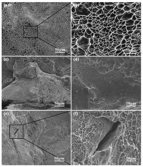 The SEM images of fracture surfaces of SLM processed Ti-55511: (a,b) horizontal sample X and (c–f) vertical sample Z at room temperature.