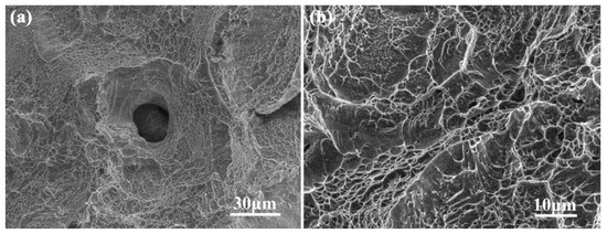 All the fracture surfaces of aged samples exhibit dimpled surfaces, cleavage surfaces, and tortuous crack growth. The SEM images of fracture surfaces of vertical sample H-Z is shown in Figure 17. The crack was initiated and grew along the precipitate-free zones (PFZ) of the αGB and α phases, which is discussed in detail in a previous work [28]. The crack propagation decreases the fracture ductility of aged samples compared with as-fabricated samples. The intergranular and transgranular fractures appear in vertical sample H-Z (Figure 17a,b); however, those without ductile fracture cannot be observed. This indicates that the decreasing of tensile residual stress increases the GND density and also the layer-by-layer bonding strength due to the precipitation of α laths after the aging. Consequently, the precipitation increases the fracture ductility of vertical sample H-Z. Compared with the as-fabricated sample Z, the plastic strength of vertical sample H-Z increases after the aging treatment. This can be confirmed by the plastic strength of as-fabricated vertical sample Z as well as aged vertical sample H-Z (Figure 3 and Figure 4).