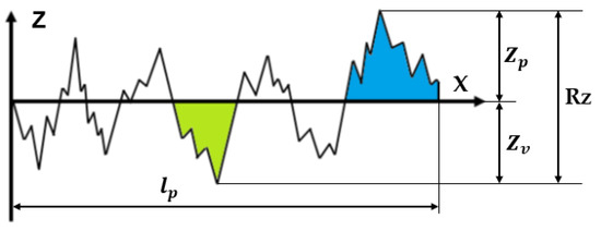 Another widely used parameter in industrial environments is Rz (see Figure 2). It is calculated as the sum of height of the maximum profile peak height and the maximum profile valley depth [19], as detailed in Equation (2):
