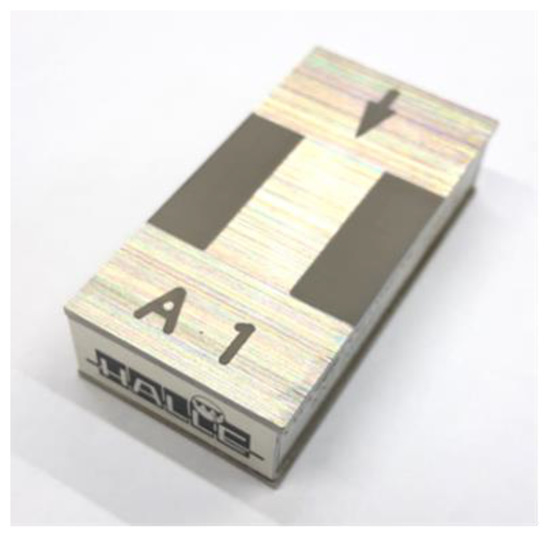 This is a metallic, pseudorandom roughness standard, HALLE brand, model A1, and the roughness parameter Ra was to be determined on its standard face. The nominal values of the standard are and . The measuring face is as indicated in the figure.